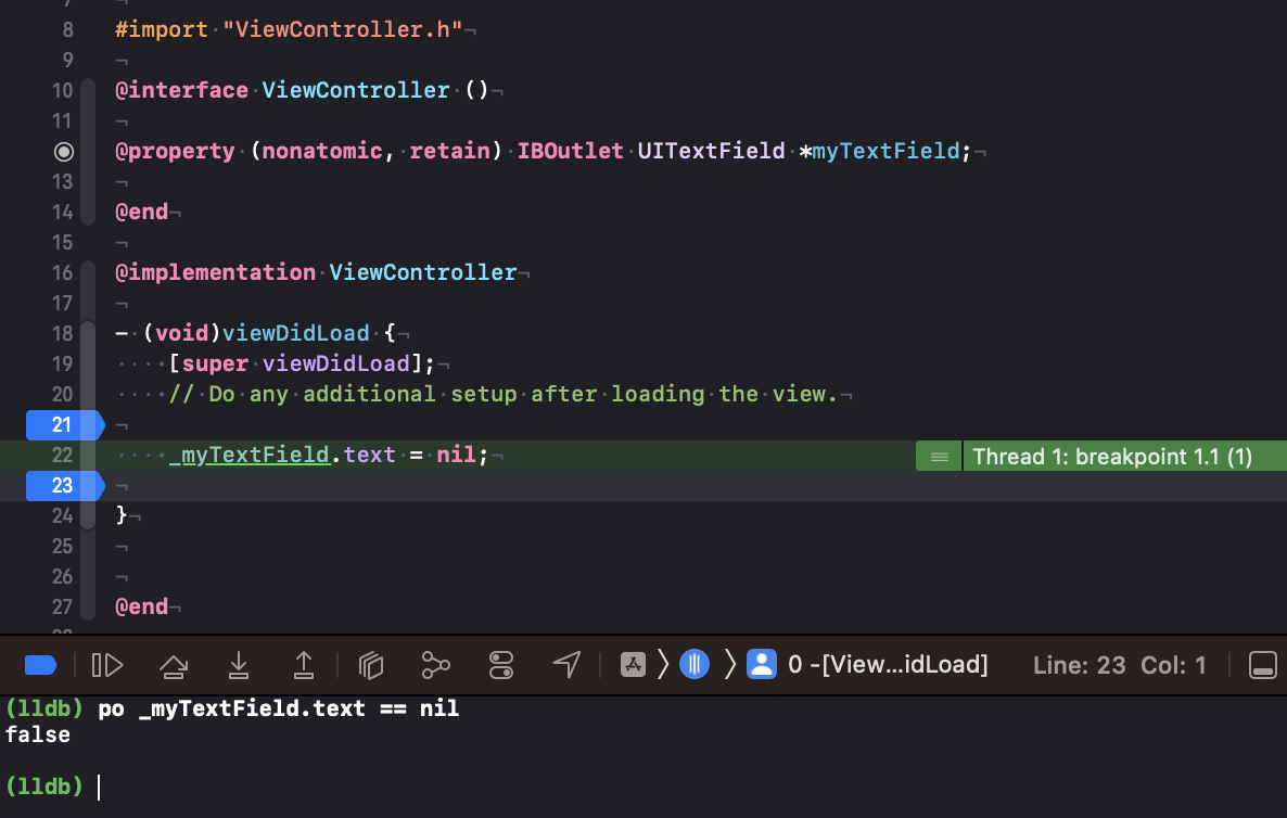 textField를 추가하고, viewDidLoad에서 breakpoint를 걸어서 nil 체크 했는데 처음에도 false, 직접 nil을 할당한 이후에도 false가 됨.. 정말 objective-c의 text가 nil이 될 수 있었던 건가,,? 아니면 나중에 바뀐건가,,?